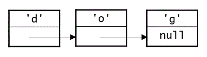 StringNodeobjects have been created. Each node includes the values of itschandnextfields, as well its starting position in memory.0xc000 0xbe00 0x3004 +--------+ +--------+ +--------+ ch | 'a' | ch | 'b' | ch | 'c' | +--------+ +--------+ +--------+ next | 0xbe00 | next | 0x3004 | next | 0xbb00 | +--------+ +--------+ +--------+ 0xa004 0xff00 0xbb00 +--------+ +--------+ +--------+ ch | 'd' | ch | 'e' | ch | 'f' | +--------+ +--------+ +--------+ next | 0xff00 | next | null | next | 0xa004 | +--------+ +--------+ +--------+Important notes: